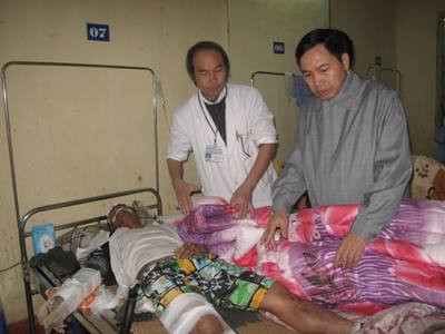 | Chủ tịch UBND tỉnh Thái Nguyên Dương Ngọc Long (bìa phải) thăm hỏi các nạn nhân ở bệnh viện. Ảnh: Báo Thái Nguyên |
