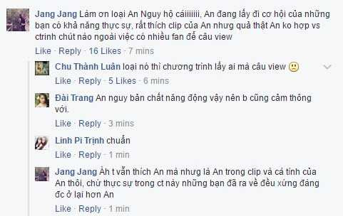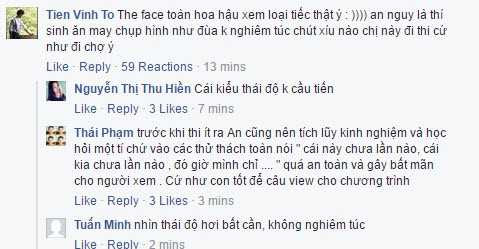 Bạn đọc Jang Jang viết: “Làm ơn loại An Nguy hộ. An đang lấy đi cơ hội của những bạn có khả năng thực sự, rất thích clip của An nhưng quả thật An không hợp với chương trình chút nào ngoài việc có nhiều fan để câu view”. Tương tự, nick name Hằng Nga Đặng chia sẻ: “Trước đây thích An Nguy qua các vlog, nhưng xem cô trong chương trình này không ưa tẹo nào. Thấy cứ như cuộc dạo chơi của chị ấy, không nghiêm túc, cợt nhả!".