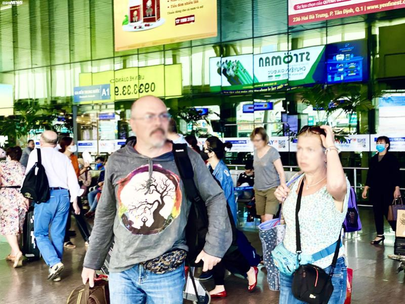 Nhiều khách nước ngoài đến Tân Sơn Nhất không đeo khẩu trang.