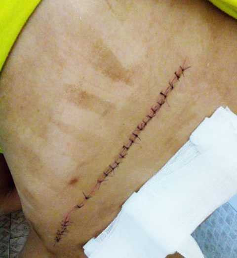 Chị Trang được người dân chở đến Bệnh viện Đa khoa khu vực Ninh Hòa cấp cứu. Tại đây, các bác sĩ đã khâu 26 mũi vắt ngang lưng của nạn nhân.