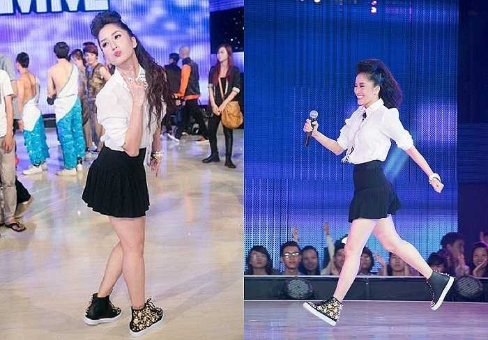Vốn sở hữu đôi chân kém thon gọn do luyện tập nhiều, Khánh Thi cũng chưa khéo trong cách lựa chọn trang phục để che khuyết điểm của mình.