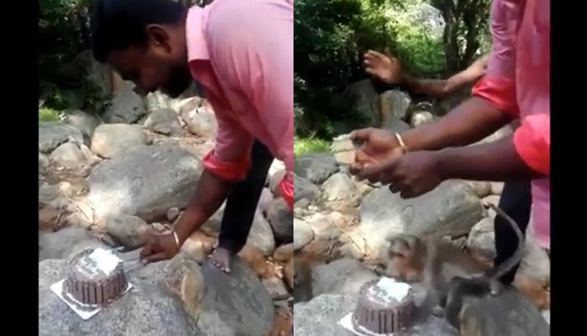 Người đàn ông chỉ mới cắt được một lát bánh sinh nhật thì chú khỉ từ đâu chạy tới cướp cả chiếc bánh rồi leo tót lên cây.