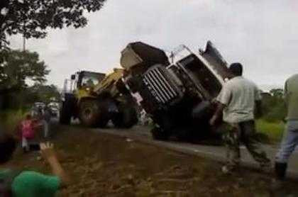 (VTC News) - Chiếc máy xúc đã lật được chiếc xe tải lên nhưng không ngờ chính việc đó lại làm cho sự việc tồi tệ hơn.