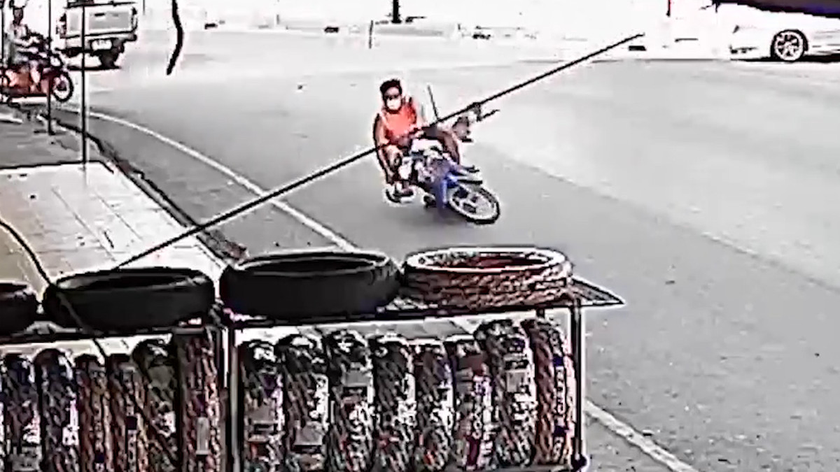 Con khỉ hoang tại Lopburi, Thái Lan điên cuồng nhảy lên xe máy quật ngã người đàn ông xuống đất để cướp túi trái cây nhưng bất thành.