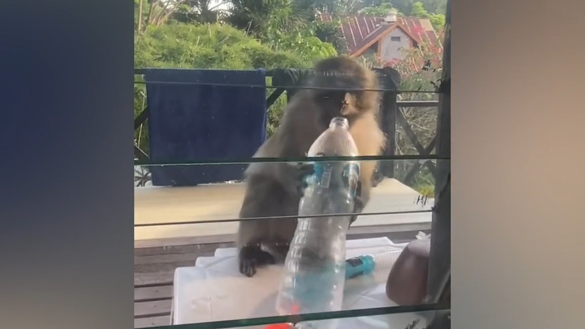 Một du khách đã bị sốc khi con khỉ hoang trên đảo Koh Phi Phi (Thái Lan) nhảy lên bàn lấy trộm chai nước và tự mở nắp uống.