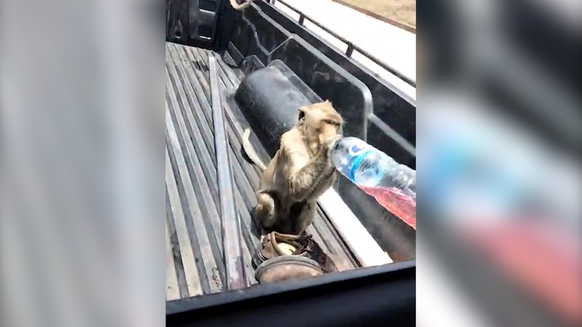 Hai con khỉ hoang lợi dụng chiếc xe đang dừng lại, nhảy lên thùng xe để tìm kiếm thức ăn, chúng đã tìm thấy một trai nước hoa quả và uống.