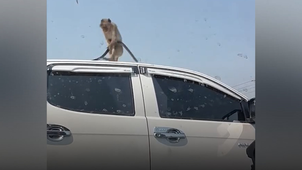 Con khỉ phá hoại xé toạc viền cao su của một chiếc xe bán tải đang dừng xe bên đường ở Thái Lan.
