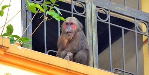 | Con khỉ có mặt đỏ, lông dài xám thường xuyên leo trèo qua các ban công của dãy nhà. |