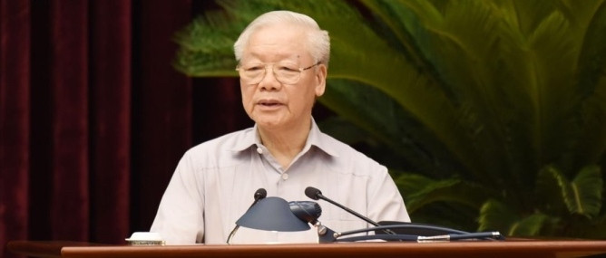 Tổng Bí thư Nguyễn Phú Trọng - Trưởng Ban Chỉ đạo Trung ương về phòng, chống tham nhũng, tiêu cực kết luận hội nghị tổng kết 10 năm thành lập Ban Chỉ đạo Trung ương. (Ảnh: Kim Anh).