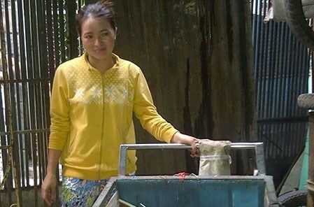 | Chị Hồng bên gánh ve chai. Ảnh: AN |