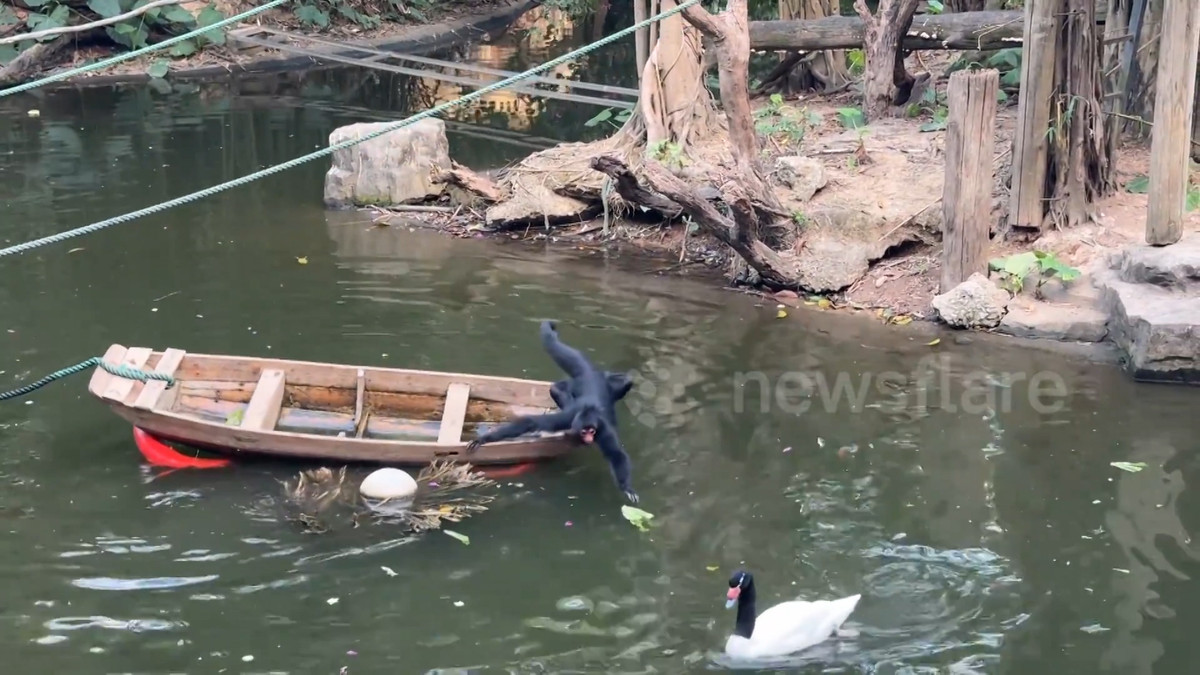 Chú khỉ nhện khéo léo điều khiển chiếc thuyền để lấy thức ăn nổi trên mặt nước tại Quảng Châu, Trung Quốc.