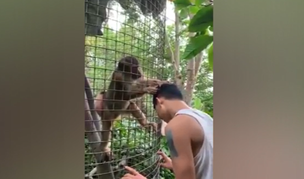 Chú khỉ chăm chú vạch tóc của chàng trai để tìm nhổ tóc sâu, trông cực kỳ khéo léo.