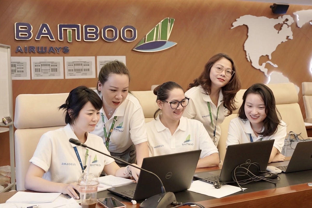 Các thành viên trong Trung tâm Dịch vụ khách hàng Bamboo Airways đang chú tâm làm việc.