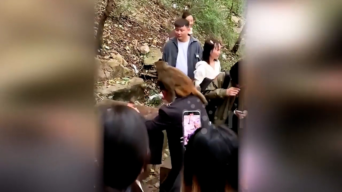 Một con khỉ bất ngờ nhảy từ trên cây xuống, bám chặt lấy đầu nam du khách ở khu danh thắng núi Kiềm Linh (Trung Quốc) rồi tinh nghịch giật phăng mái tóc giả.