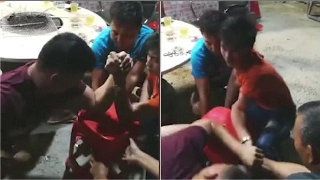 Người đàn ông Trung Quốc bị gãy xương răng rắc chỉ vài giây sau khi bắt đầu vật tay với bạn nhậu có thân hình to lớn, tai nạn khiến ai nấy chứng kiến đều khiếp đảm.