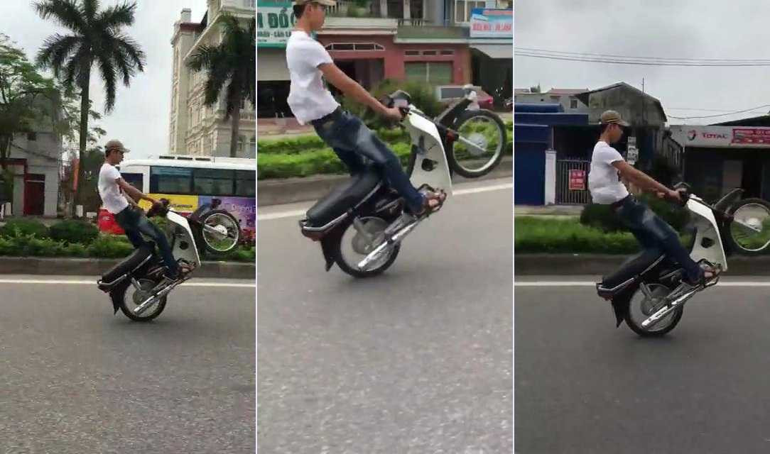 Nam thanh niên không đội mũ bảo hiểm liều lĩnh bốc đầu xe máy, phóng tốc độ cao suốt một quãng đường dài trên xa lộ khiến người xem khiếp đảm.