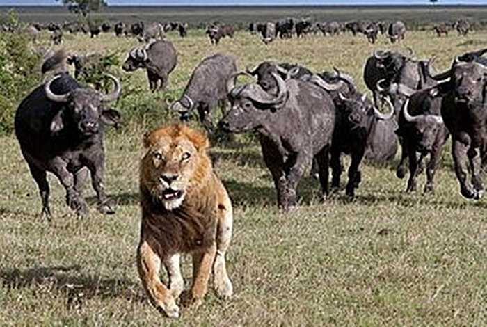 Trâu rừng với sức mạnh và cặp sừng nhọn hoắt sẵn sàng chiến đấu húc thẳng vào sư tử