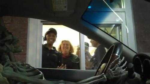 (VTC News) - Bộ xương cầm vô lăng ôtô tiến vào mua hàng khiến các nhân viên hoảng hồn.