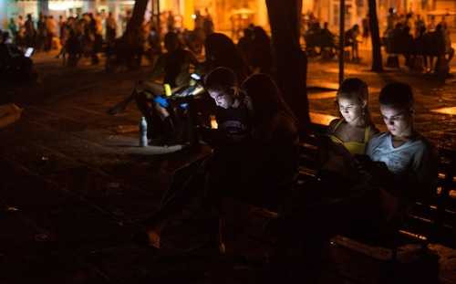 Tất cả những băng ghế, bờ tường, xung quanh thùng rác và khóm cây đều chật ních người chúi mũi vào máy tính cá nhân hoặc đang dùng điện thoại thông minh. Nhiều người không ngớt chọc chọc tay vào màn hình.