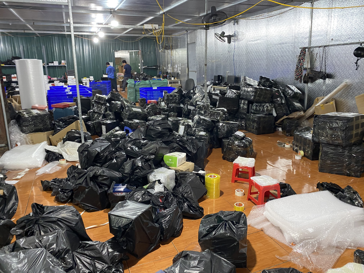 Kho hàng lậu hơn 10.000 m2 được rào chắn, cửa khóa then cài, có bảo vệ và chó becgie canh gác, chủ yếu bán hàng qua hình thức livestream trên facebook nên người ngoài không hề hay biết.
