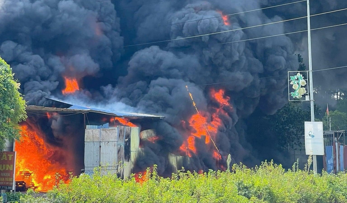 Do khu nhà xưởng chứa nhiều vật liệu dễ cháy như cao su, nhựa… nên đám cháy bùng phát lớn, lan nhanh, cột khói cuồn cuộn bốc cao.