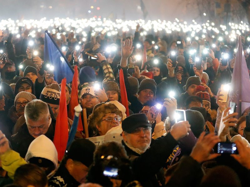 Hàng nghìn người tuần hành xung quanh tòa nhà Quốc hội ở thủ đô Budapest, Hungary và trụ sở đài truyền hình trung ương trong cuộc biểu tình thứ tư và lớn nhất kể từ khi điều luật lao động mới được thông qua cuối tuần trước.