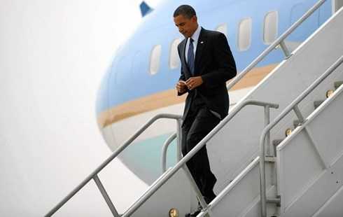 | Tổng thống Mỹ Barack Obama đang bước xuống từ chiếc chuyên cơ Boeing 747-200 (Air Force One). |