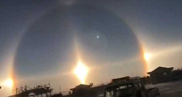 Theo các nhà khoa học, ba mặt trời mọc cùng lúc là một hiện tượng tự nhiên hiếm gặp có tên là Sundog (Mặt trời giả). Nó xảy ra khi vòng hào quang xuất hiện quanh mặt trời và khi ánh sáng tương tác với các tinh thể băng trong bầu khí quyển.