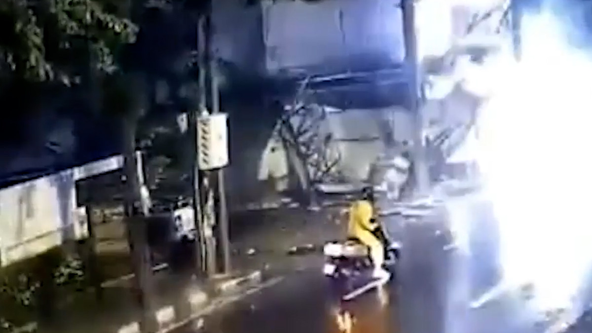Ban công của một tòa nhà nằm ở mặt đường tại Bangkok, Thái Lan đổ sập xuống, người đi xe máy đã kịp dừng lại để tránh bị vật liệu rồi vào người.