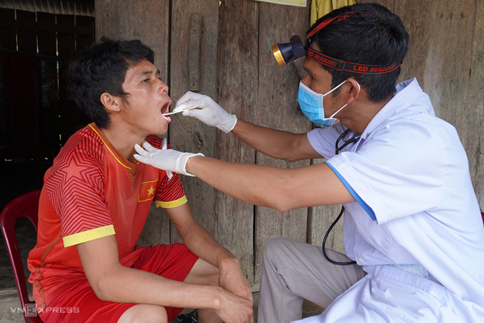 Trong khi GIàng A Phủ được chuyển về Bệnh viện Bệnh Nhiệt đới TP HCM, thì ở quê nhà Đăk Nông, anh trai của em (áo đỏ), 20 tuổi, được bác sĩ lấy mẫu bệnh phẩm xét nghiệm bạch hầu. (Ảnh: Trần Hóa)
