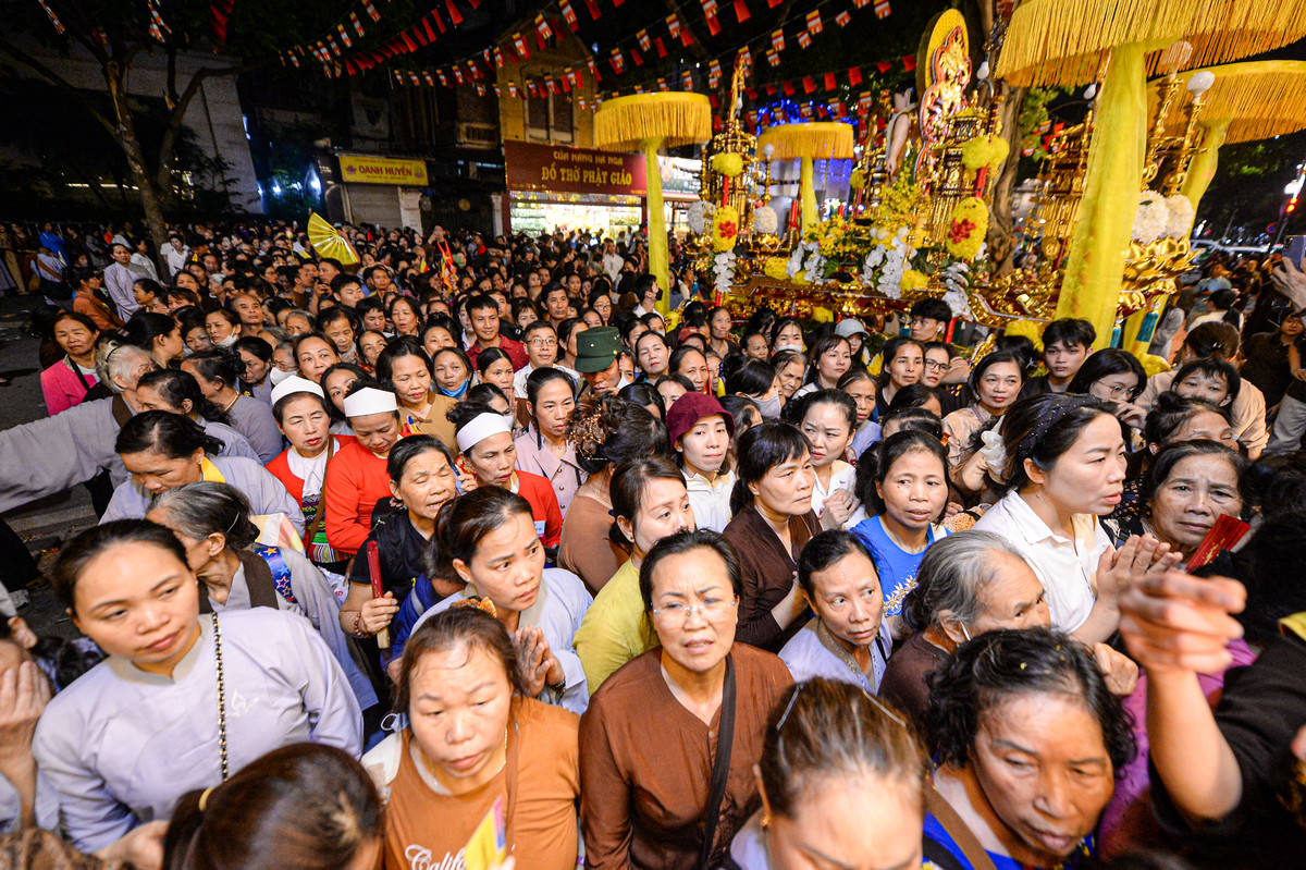 Trước đó, vào 19h cùng ngày, đoàn xe được trang trí công phu bằng hoa tươi, cờ Phật giáo và hệ thống ánh sáng rực rỡ bắt đầu diễu hành qua các tuyến phố: Lý Thường Kiệt, Hàng Bài, Đinh Tiên Hoàng, Lý Thái Tổ, Hai Bà Trưng… trước khi quay trở lại chùa Quán Sứ.
