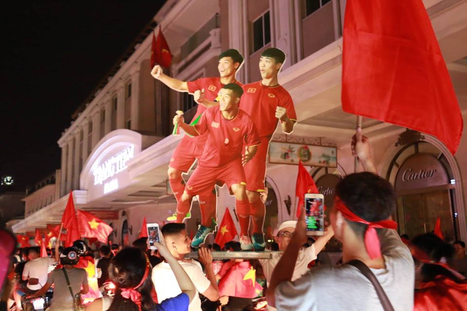 Cổ động viên Thủ đô đổ xô ra đường ăn mừng chiến thắng. (Ảnh: Xuân Trường)