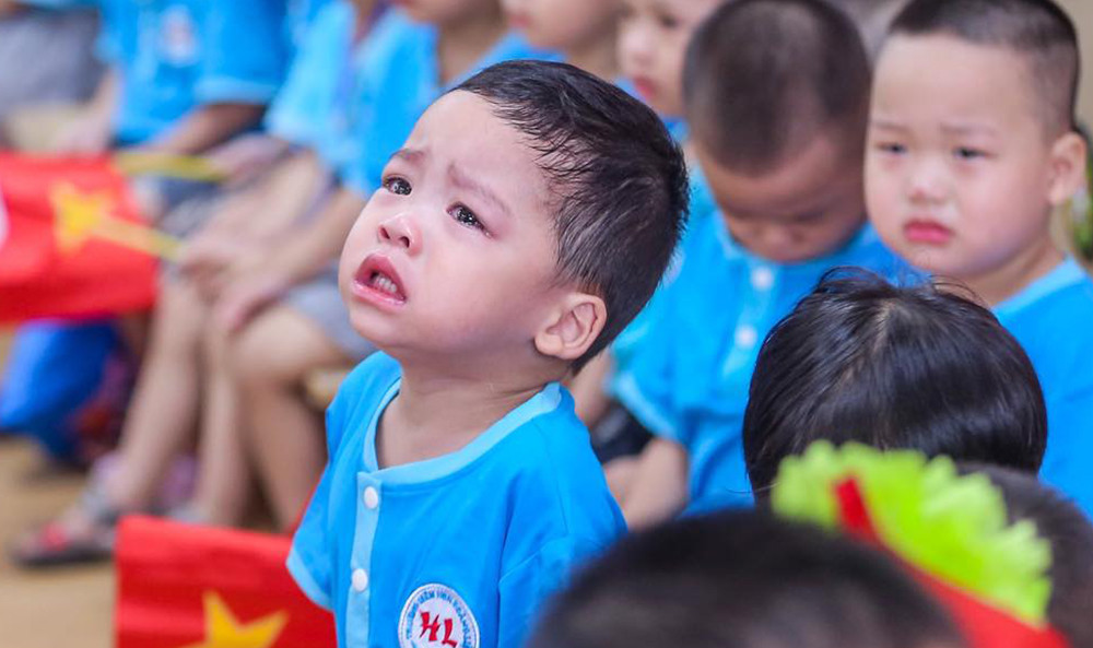 Lần đầu tới trường còn nhiều bỡ ngỡ, nhiều trẻ mếu máo khóc.