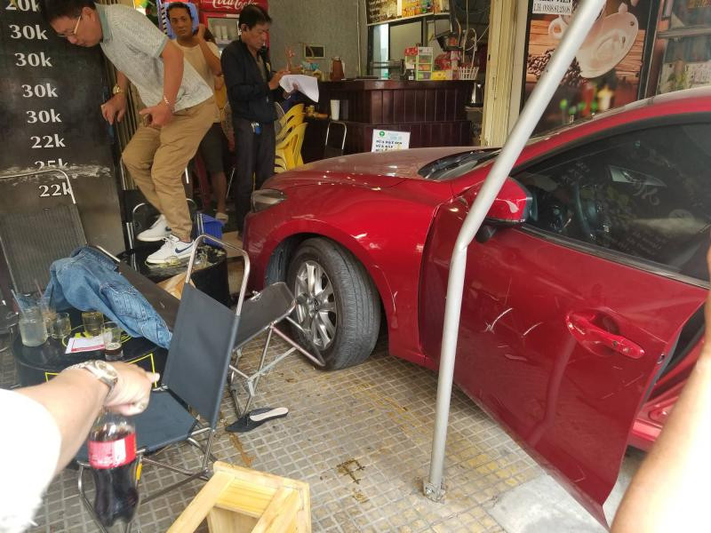 Tại hiện trường, nhiều bàn ghế quán cà phê bị tông đổ văng khắp nơi, ô tô cũng bị hư hỏng nặng phần đầu. Vụ tai nạn khiến 2 người khách ngồi uống cà phê bị thương và được đưa đi cấp cứu ngay sau đó.