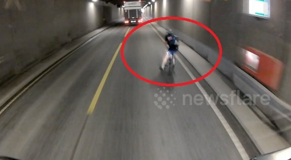 Người đàn ông đi xe đạp trong hầm cao tốc bất ngờ bị va vào tường hầm, loạng choạng tay lái; may mắn chiếc ô tô đi sau vẫn kiểm soát được tốc độ.