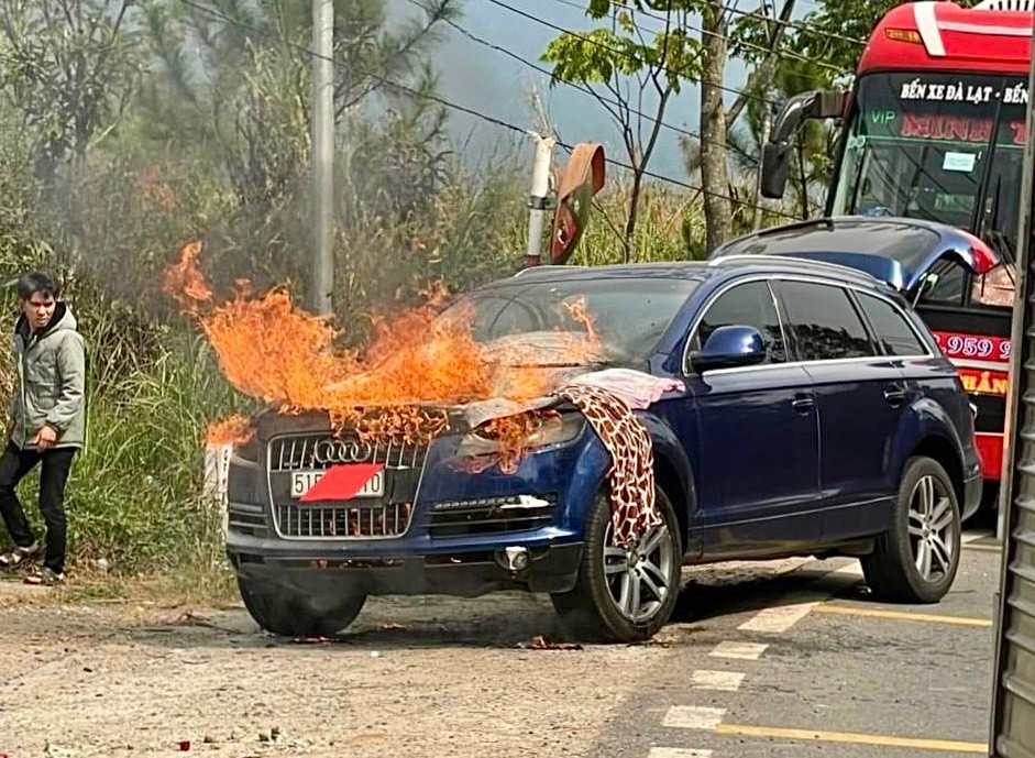 Khoảng 14h30 ngày 13/4, ô tô Audi đang lên đèo Mimosa (TP Đà Lạt, Lâm Đồng) thì bốc cháy dữ dội, tài xế nhanh chóng thoát ra ngoài.