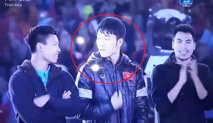 Khi nghe MC xướng tên Xuân Trường, hàng vạn CĐV trên sân Mỹ Đình reo hò rộn rã nhưng chàng đội trưởng U23 Việt Nam lại có biểu cảm "ngẩn tò te" hết sức đáng yêu. Như còn chưa chắc, anh quay sang hỏi người đồng đội Văn Thanh: "Ai đấy? Anh à?" và được Văn Thanh xác nhận: "Anh đấy". Lúc này, chàng đội trưởng mới nở nụ cười híp mí "thương hiệu" trong tiếng reo hò không ngớt của người hâm mộ.
