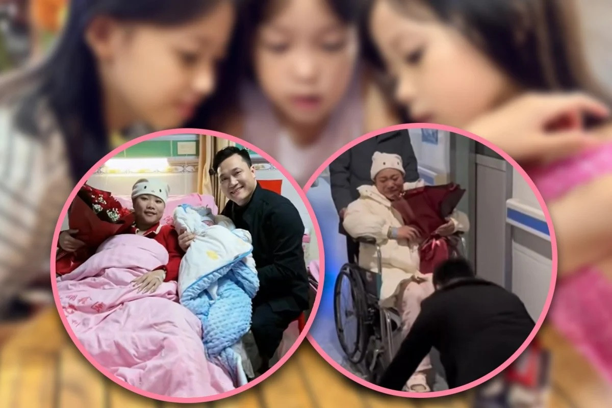 Người đàn ông giấu tên ở Mai Châu, Quảng Đông, Trung Quốc chia sẻ đoạn video lên mạng Douyin, thông báo sự ra đời của đứa con thứ tư - cậu con trai tuổi rồng. Trước đó, vợ chồng anh đã có 3 con gái. Người vợ ngồi trên xe lăn, tay cầm bó hoa chồng tặng. Người đàn ông quỳ xuống trước mặt vợ, sau đó ôm và hôn cô, khiến cô cảm động đến mức ôm mặt, lau nước mắt.