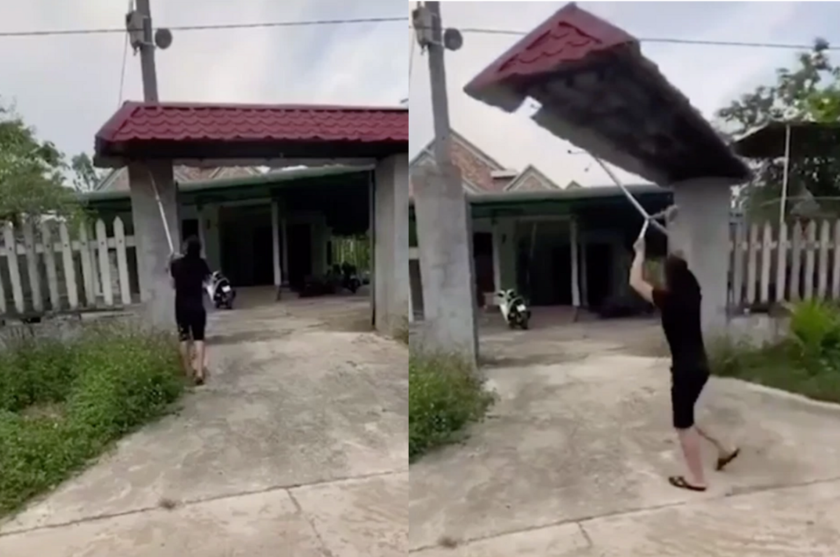 Đính kèm dòng caption ngắn là hình ảnh chiếc cổng với 2 bên được xây dựng bằng xi măng khá chắc chắn, duy chỉ có mái che là... di động. Mái che không cố định, để cho xe tải vào, chủ nhà phải dùng thanh sắt để nhấc mái che sang 1 bên, sau khi xong công việc lại làm tương tự để... đậy mái che lại.