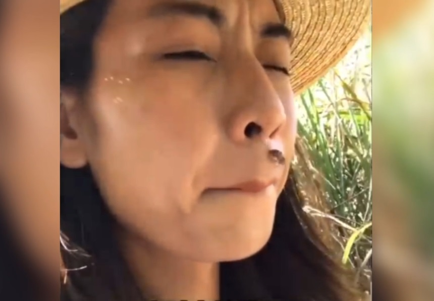 Sau khi vui vẻ vì được ăn mật ong nguyên chất, cô gái méo mặt khi bị đàn ong vây quanh và đốt lên miệng.