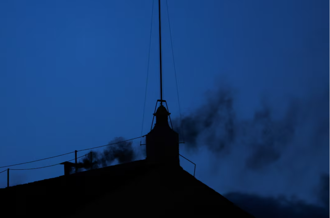 Khói đen bốc lên từ ống khói trên Nhà nguyện Sistine, cho thấy chưa có quyết định nào được đưa ra để bầu một giáo hoàng mới, tại Vatican, ngày 7/5. (Ảnh: Reuters)