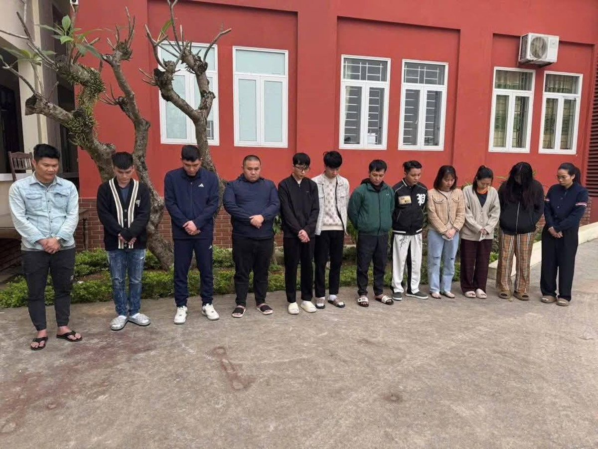 12 trong tổng số 15 bị can trong tổ chức lừa đảo xuyên biên giới bị Công an Quảng Bình khởi tố. (Ảnh: CA)