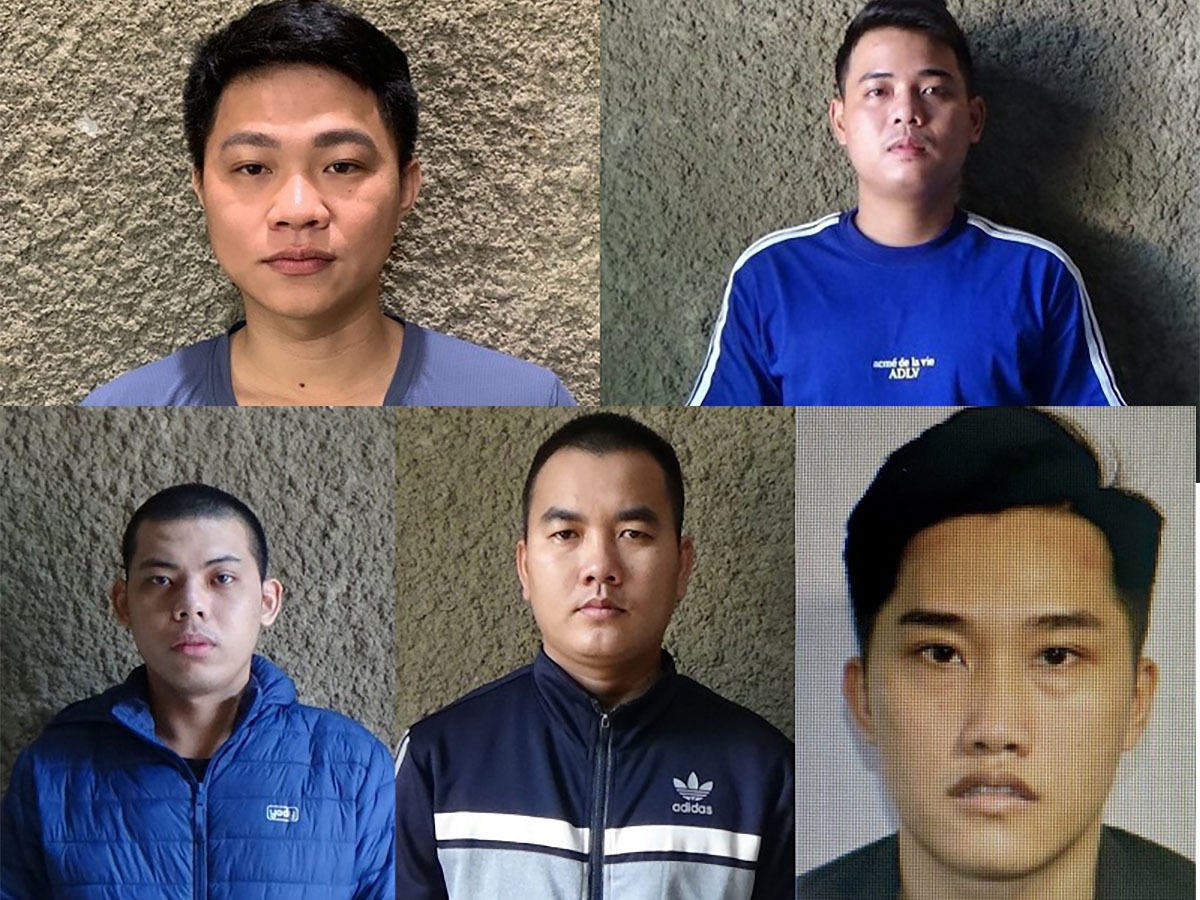 Các bị can Lê Thanh Phúc, Nguyễn Hoài Sơn, Đường Trung Trực, Hồng Minh Đạt, Tưởng Thanh Tri (từ trên xuống dưới, từ trái qua phải)