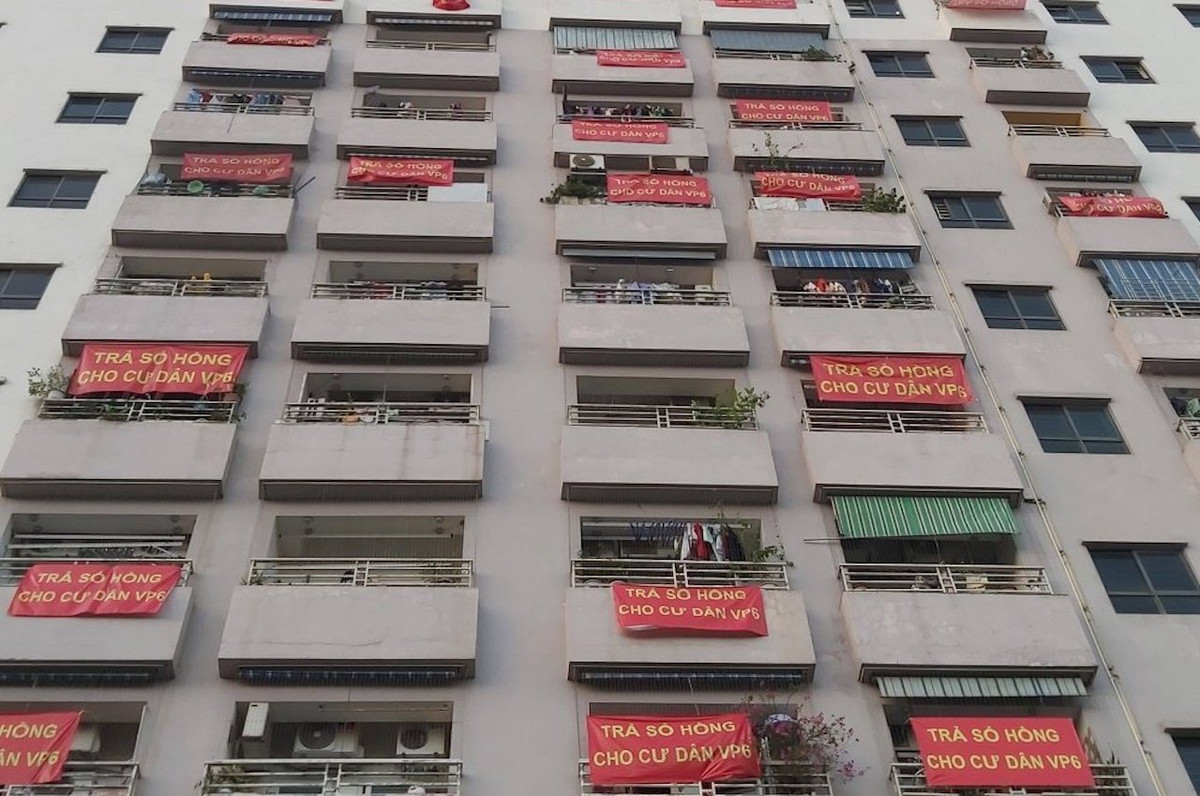 Người dân chung cư VP6 căng băng rôn để đòi sổ hồng cách đây nhiều năm.