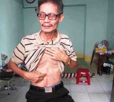 | Ông Sáu chỉ vết thương vì bị con ruột đâm. |