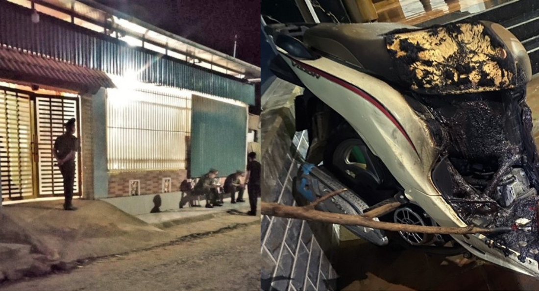 Chiếc xe máy của gia đình chị T. bị đốt cháy. (Ảnh: CTV).
