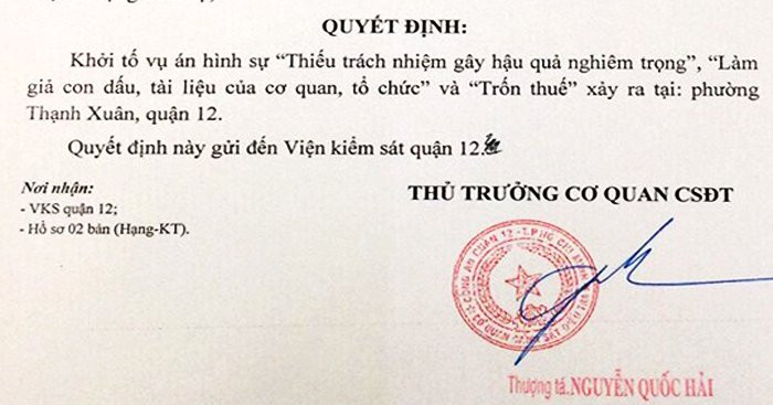 Ngày 31/5, thông tin từ cơ quan Cảnh sát điều tra (CSĐT) Công an quận 12 (TP.HCM) cho biết, đơn vị đã khởi tố vụ án hình sự về hành vi “Thiếu trách nhiệm gây hậu quả nghiêm trọng, làm giả con dấu, tài liệu của cơ quan, tổ chức và trốn thuế”.