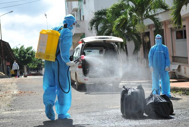 Ngành Y tế Bình Định phun khử khuẩn nơi có ca nhiễm COVID-19.