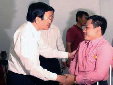 | Chủ tịch Nước Trương Tấn Sang (bên trái) tiếp xúc cử tri sau khi trả lời những kiến nghị. |