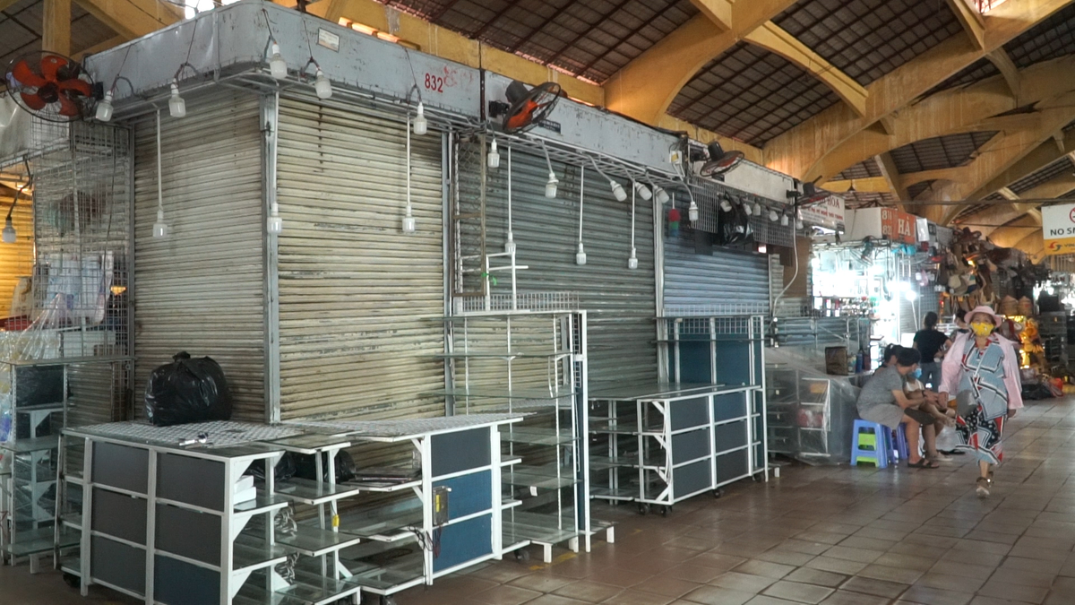 Hơn 50% các sạp hàng ở chợ Bến Thành (quận 1, TP.HCM) đóng cửa hoặc treo biển cho thuê vì dịch COVID-19, không có khách nước ngoài.